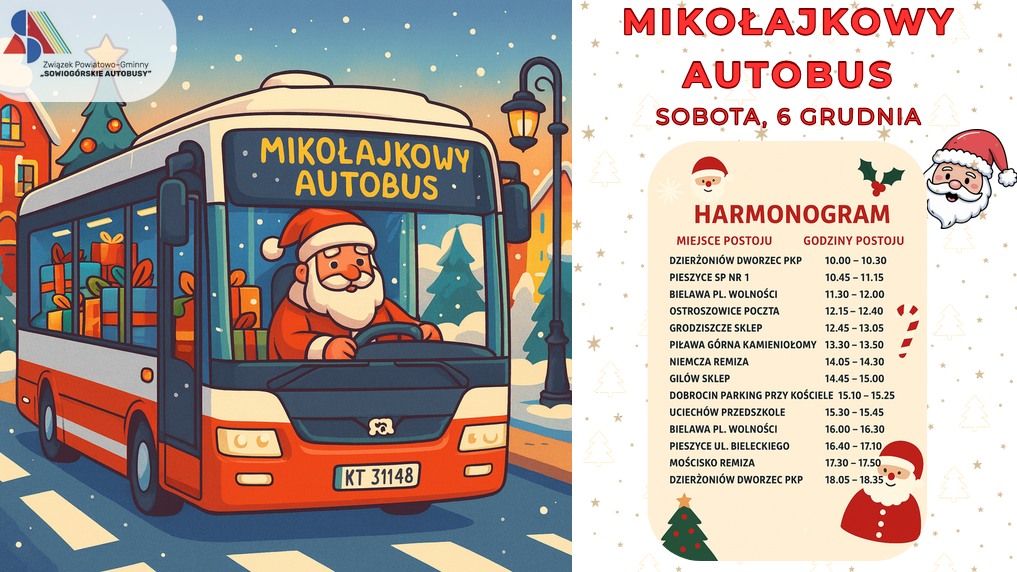 W sobotę, 6 grudnia, nasz Mikołajkowy Autobus odwiedzi kilka miejscowości obsługiwanych na co dzień przez regularne połączenia organizowane przez Związek Powiatowo-Gminny „Sowiogórskie Autobusy”. Tego dnia będzie to jednak zupełnie wyjątkowy pojazd, którego nie znajdziecie w standardowych rozkładach jazdy. Ruszy przed godziną 10.00 i pojawi się w Dzierżoniowie, Pieszycach, Bielawie, Ostroszowicach, Grodziszczu, Piławie Górnej, Niemczy, Gilowie, Dobrocinie, Uciechowie, a potem ponownie w Bielawie, Pieszycach, następnie w Mościsku, a całą podróż zakończymy w Dzierżoniowie!