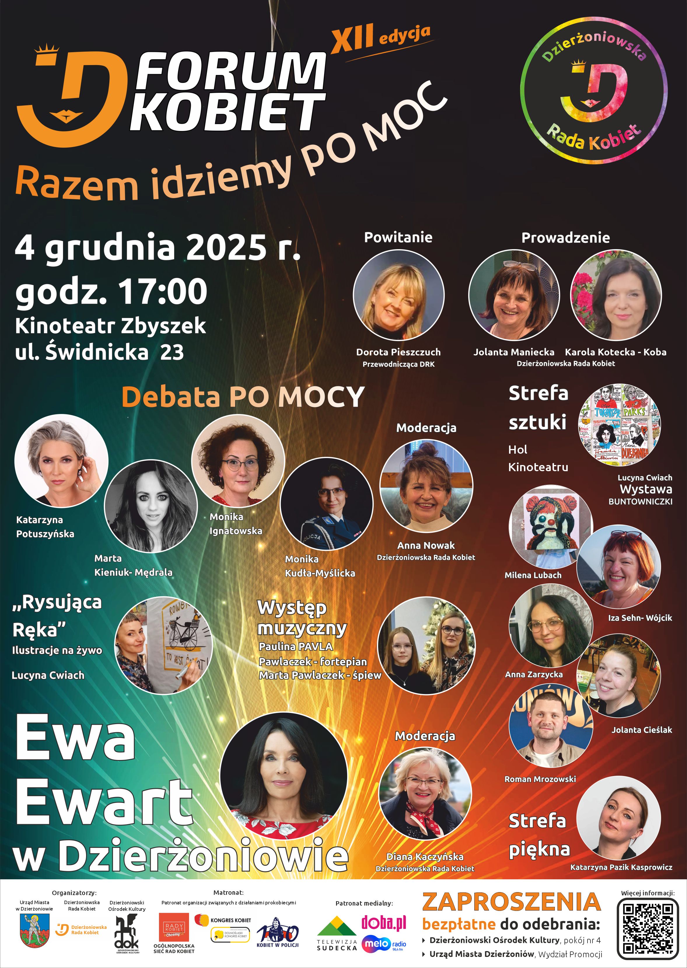 Ewę Ewart, dziennikarkę i wielokrotnie nagradzaną reżyserkę filmów dokumentalnych, będziemy gościć na tegorocznym Forum Kobiet. Ilustracje na żywo wykonywała będzie Lucyna Cwiach, czyli „Rysująca Ręka”. Będą też strefy sztuki i piękna. XII edycja imprezy odbędzie się 4 grudnia w dzierżoniowskim Kinoteatrze „Zbyszek” pod hasłem „Razem idziemy PO MOC”. W trakcie debaty PO MOCY poznacie cztery wyjątkowe kobiety.