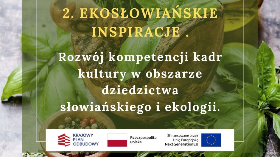 Projekt pt. „2. Ekosłowiańskie Inspiracje. Rozwój kompetencji kadr kultury w obszarze dziedzictwa słowiańskiego i ekologii.” zakłada cykl warsztatów, spotkań i szkoleń dla kadry bibliotecznej, które połączą wiedzę z zakresu dziedzictwa kulturowego Słowian z tematyką zrównoważonego rozwoju i ekologii. Uczestnicy projektu będą zdobywać nowe umiejętności przydatne w codziennej pracy z czytelnikami oraz w tworzeniu oferty kulturalno-edukacyjnej biblioteki.