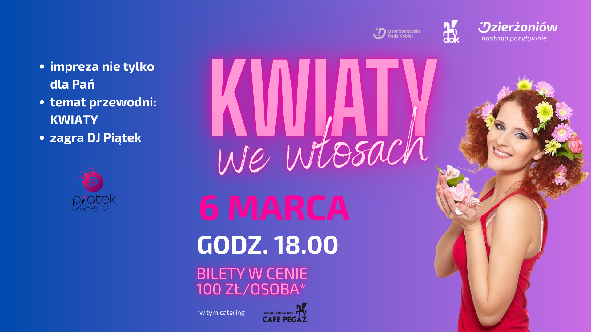 W programie wieczoru znalazła się przede wszystkim zabawa taneczna przy muzyce, która z pewnością porwie do tańca nawet tych, którzy zwykle stoją z boku. Tytułowe kwiaty we włosach – czy to we fryzurze, we wzorze na sukience, czy w formie dodatku – będą mile widzianym akcentem, podkreślającym wiosenny, radosny charakter spotkania.