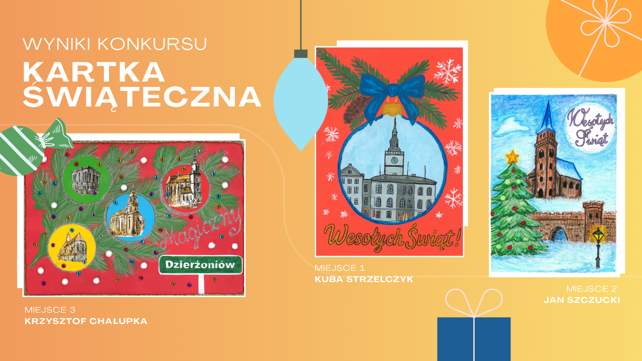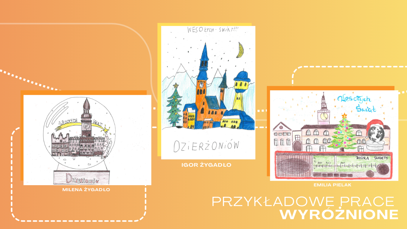 Po wnikliwej analizie jury przyznało I miejsce Kubie Strzelczykowi, którego kartka wyróżniła się dojrzałą kompozycją, harmonijnym połączeniem symboliki świątecznej z rozpoznawalną architekturą Dzierżoniowa oraz wyjątkową starannością wykonania.