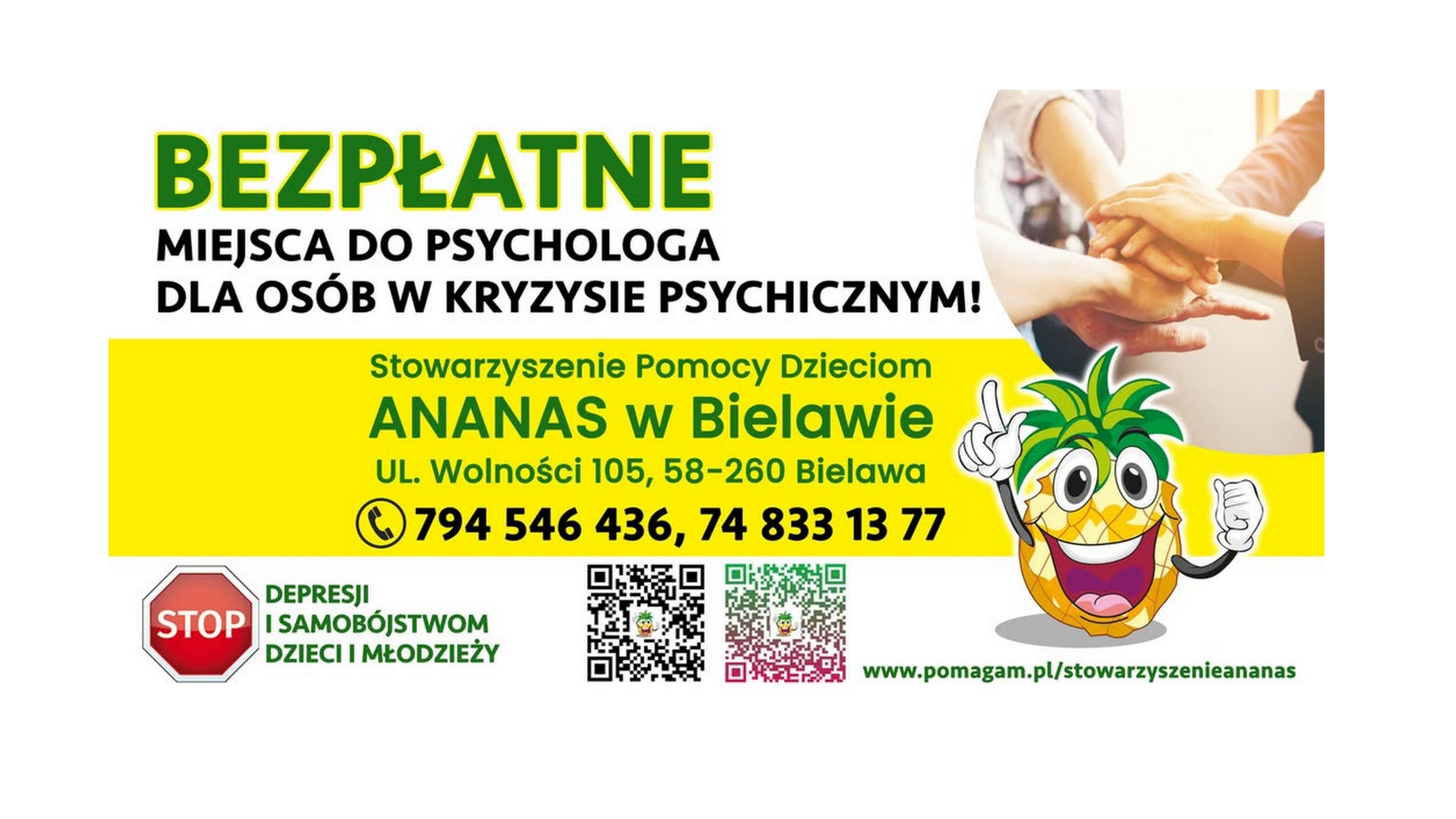 Stowarzyszenie Pomocy Dzieciom ANANAS wspólnie z Prywatną Poradnią Psychologiczno-Pedagogiczną MENTOR w Bielawie prowadzi akcję STOP DEPRESJI. To program bezpłatnego wsparcia psychologicznego dla dzieci, młodzieży i dorosłych w kryzysie zdrowia psychicznego.